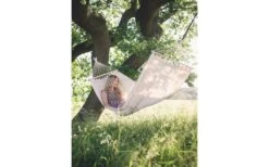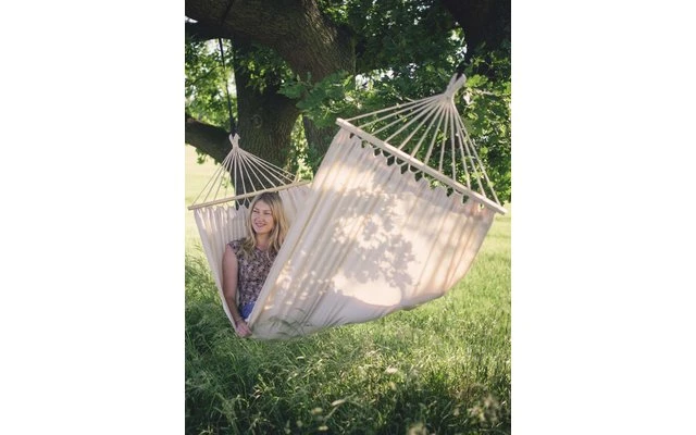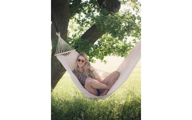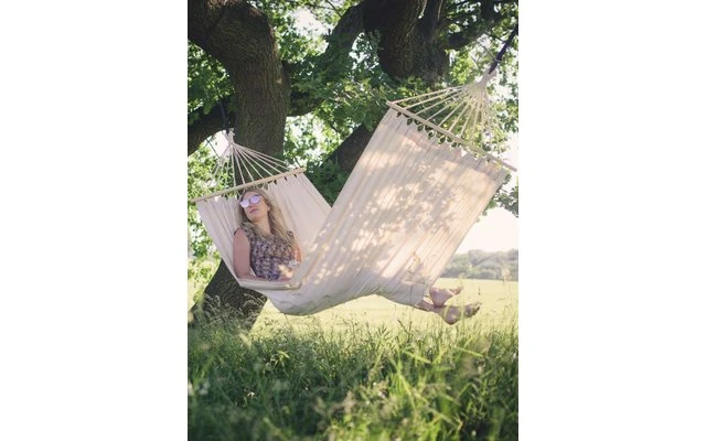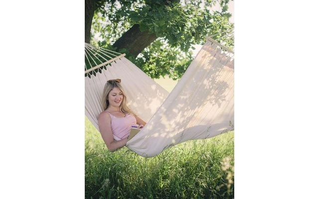 Hängematte aus wetterfestem und UV-beständigem EllTex-Material, extra haltbar und doch kuschelig wie Baumwolle.