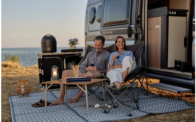 Platzsparender Tisch mit Aluminiumgestänge. Zusammenfaltbare, elegante Bambustischplatte. Leichter Aufbau durch moderne Falttechnik.