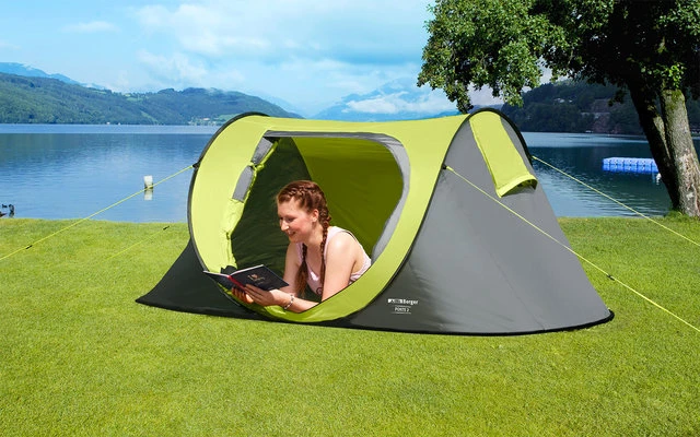 Extrem leichtes, einwandiges Wurfzelt für laue Sommernächte. Zwei seitliche Dauerbelüftungen. Moskitogaze-Lüftung am Eingang.