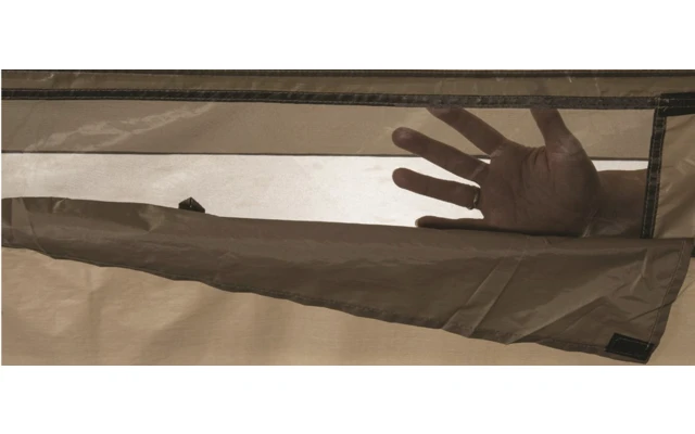 - Die Netztür kann für eine dichte Abdichtung mit einem Reißverschluss an der Bodenplane befestigt werden