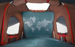 Luftkammerfutter an der Innenseite der Hartschale und an der Matratze sorgt für wohlige Atmosphäre im Dachzelt. Die Innenseite der Hartschale ist mit einer dekorativen Weltkarte versehen und lädt zum Träumen von fernen Ländern ein.