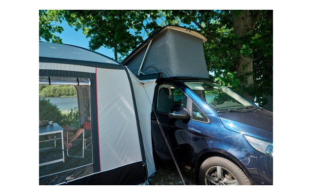 Die Verbindungsschleuse wird per Reißverschluss mit dem Vorzelt verbunden und lässt sich sehr schnell auch wieder lösen, um z.B. einen Tagesausflug mit dem Fahrzeug zu unternehmen. Die Fahrzeugspezifische Schleuse ermöglicht einen sehr guten Abschluss am Fahrzeug.