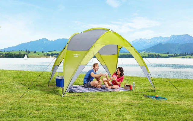 Leichter Pavillon mit UV Schutz 50+. Wird mittels drei Fiberglasstäben aufgebaut. Ink. 2 Seitenteile, die mittels Klettband am Pavillon befestigt werden können. In zwei Farben erhältlich.